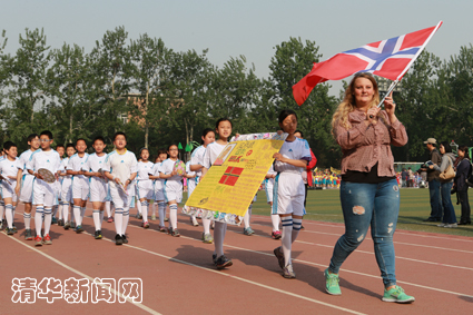 来自挪威大使馆、哥斯达黎加大使馆的客人以及喀麦隆前国脚也参与了开幕式。他们与清华附小的学生一起,走在自己“国家的队伍”里面,一起展现自己国家的足球文化,共庆清华附小世界杯的开幕。