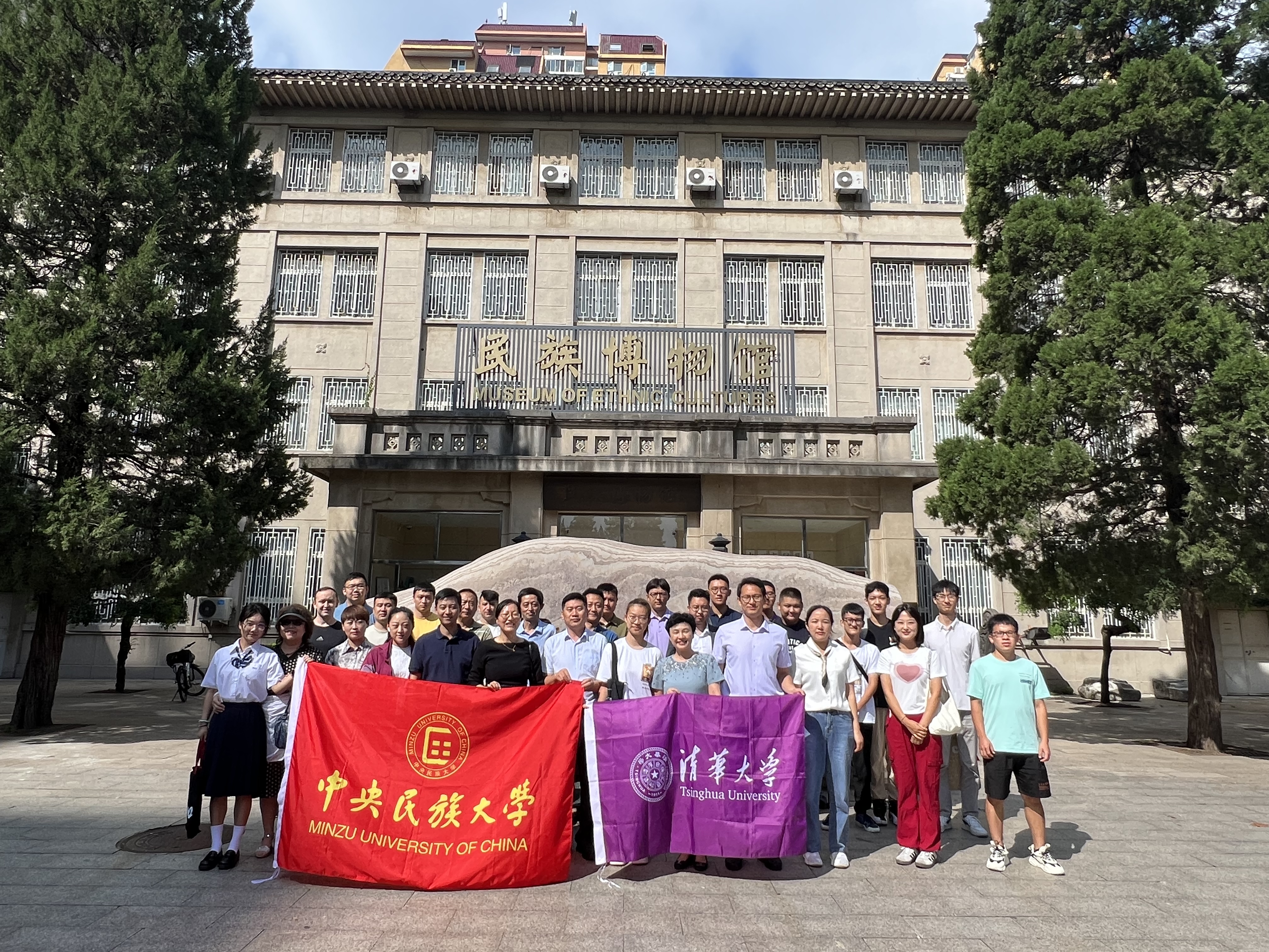 在参观交流环节,两校相关部门的负责教师和少数民族骨干学生共计33人一起参观了民族博物馆。民族博物馆是坐落在中央民族大学的北京市民族团结教育基地之一,博物馆负责教师结合精心布置的展览为师生讲解了“铸牢中华民族共同体意识”提出的背景、内涵和理论贡献,介绍了中央民族大学的悠久校史、学术大师和民族文化工作者的成就,并从民族服饰、乐器等角度切入,讲解了中华民族多元一体的文化历史。